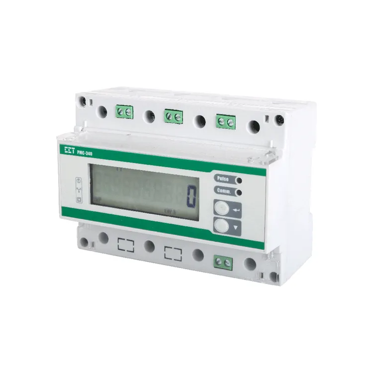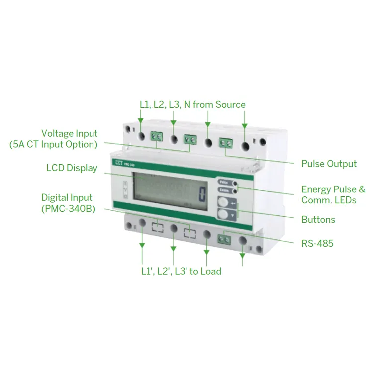 The PMC-340 Series Digital Three-Phase Energy Meter is CET's latest offer for the low voltage power/energy metering market featuring DIN-Rail mount, high accuracy, multifunction true RMS measurements and a large, easy to read LCD display. The PMC-340 complies with the IEC 62053-21: 2020 Class 0.5 and IEC 62053-22: 2020 Class 0.5S kWh Accuracy Standards for 100A Direct Input and 5A CT Input, respectively. In addition, the PMC-340-B has received the Certificate of Approval from the National Measurement Institute (NMI) of Australia and been verified by UL with reference to NMI M6-1 Electricity Meters, Part 1: Metrological and Technical Requirements. The PMC-340 comes standard with a LED as well as a Solid State Pulse Output for energy pulsing. The PMC-340 optionally provides 2MB memory for Data Recording and 3 Digital Inputs for status monitoring, Tariff switching or pulse counting for collecting WAGES (Water, Air, Gas, Electric and Steam) information. The standard RS-485 port and Modbus protocol support allows the PMC-340 to become a vital component of an intelligent, multifunction monitoring solution for any Power and Energy Management Systems.